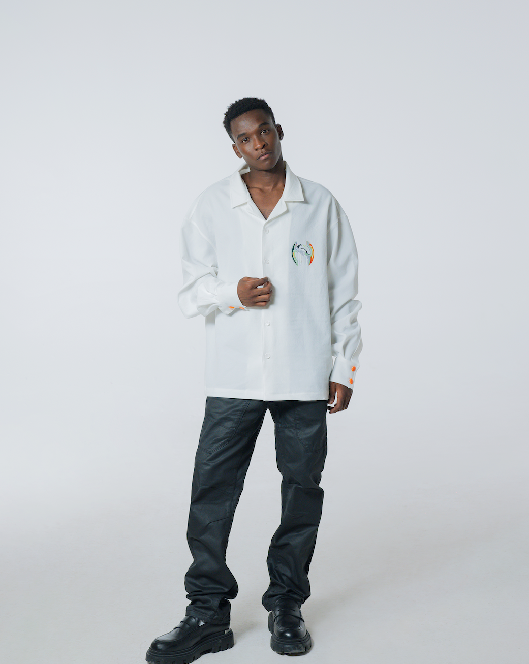 This white oversized shirt features a unique design with pops of orange and button detailing on the sleeves. Crafted with high-quality materials, this shirt offers comfort and style. A versatile addition to any wardrobe, perfect for both casual and formal occasions.